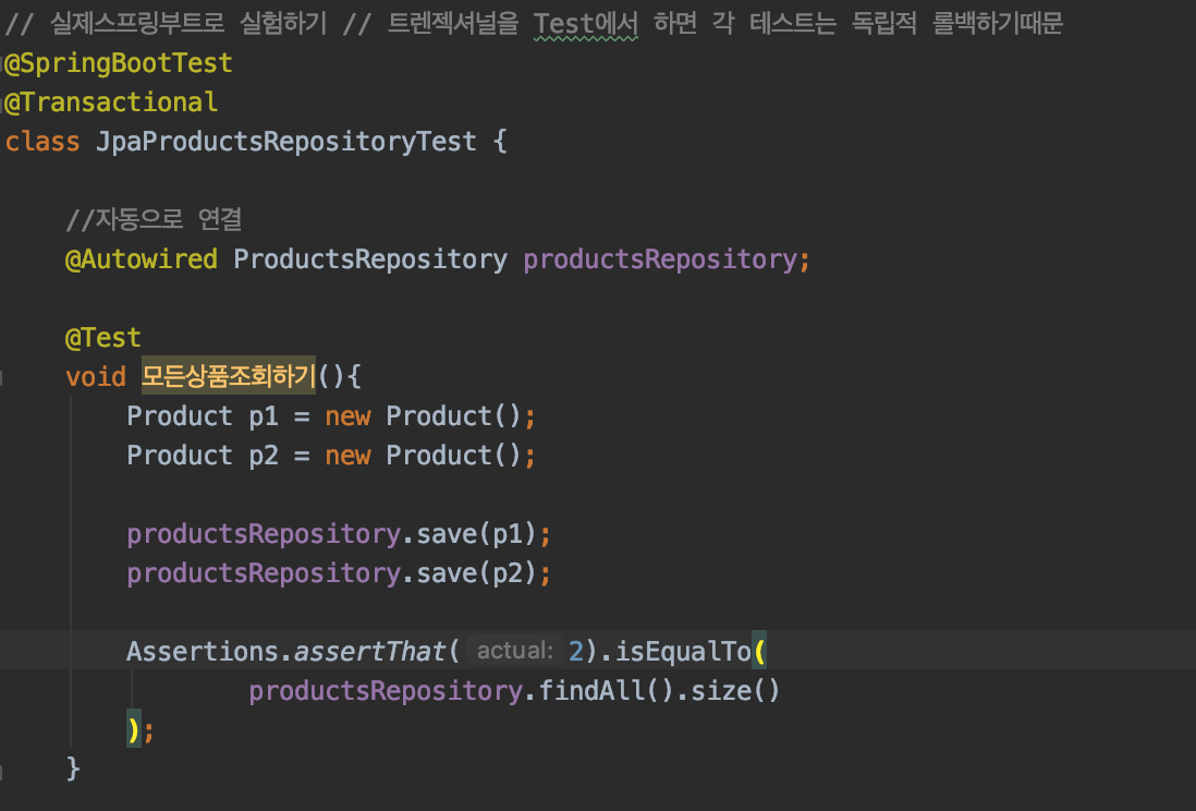 @Transactional : 레포지토리 기능을 테스트 할때 거의 필수 적인데 모든 테스트 메소드를 독립적으로 만들어 준다. 내부적으로 메소드 실행후 자동으로 롤백해준다. 자세한 원리는 이후에 공부할 것이다.