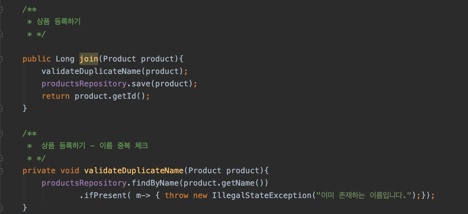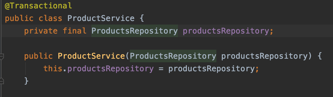 서비스를 하기위해서는 레포지토리에 반드시 의존해야한다. productsRepository 인터페이스를 선언한뒤 생성장를 통해 주입해주자.